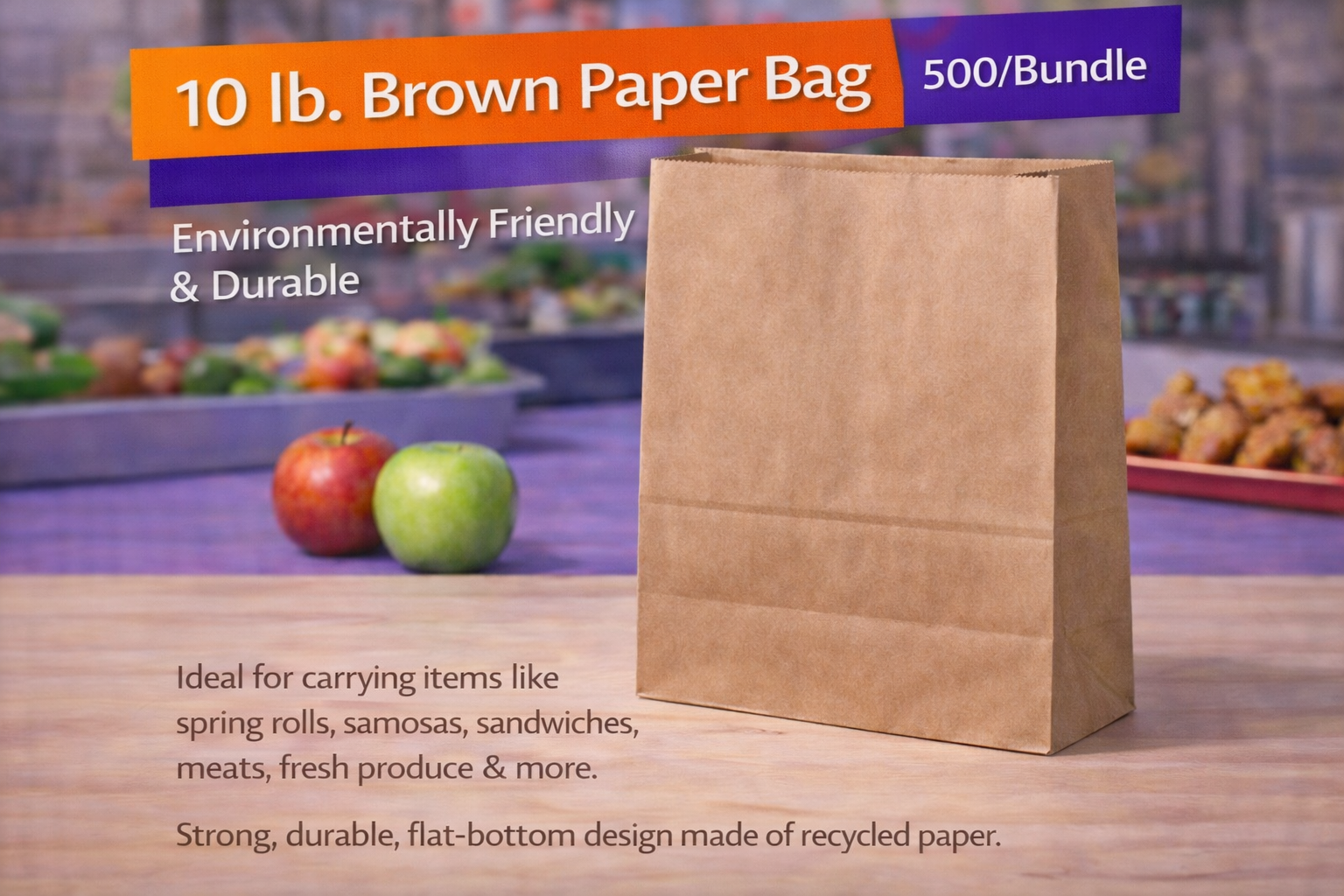 These bags are used for a variety of products like spring rolls, samosas, sandwiches, meats, fresh fruits, vegetables and many other products. This bag is very convenient for customers to take home products from grocery stores, restaurants, bakeries, and deli’s. They are strong enough to hold items without ripping, and very durable for your packaging needs. The Flat bottom of the bag allows it to stand up on its own and will hold your items securely while taking them home. They are made out of recycled paper so they are environmentally friendly and do not contain any harmful chemicals. By using these bags, your contributing to the environment and helping the planet.