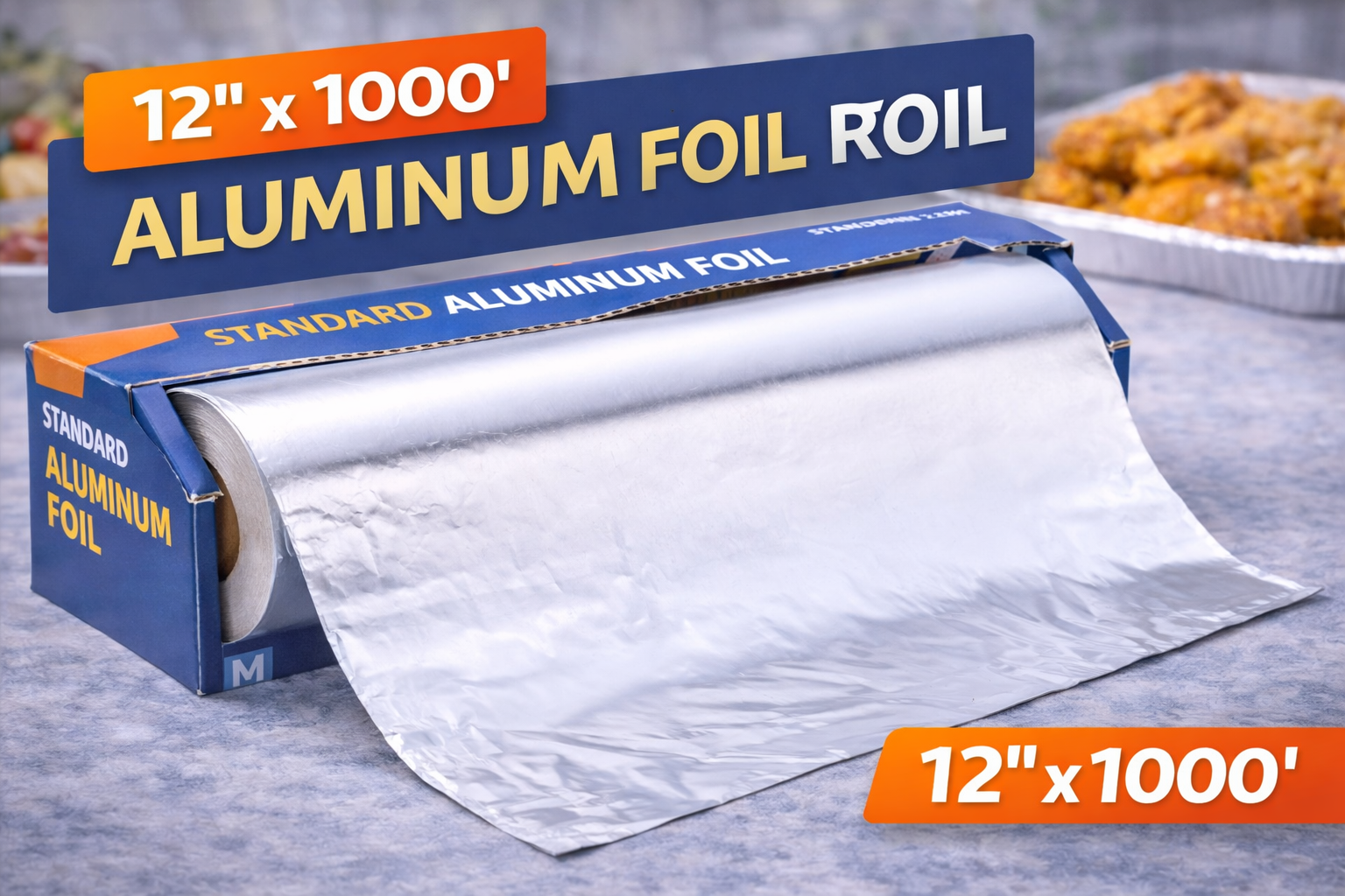 This standard weight aluminum foil roll is used for various food service applications like wrapping food to sandwich wraps to bagels to covering foil pans. The convenient packaging and easy-to-use blade makes this aluminum foil perfect for the kitchen or restaurant.