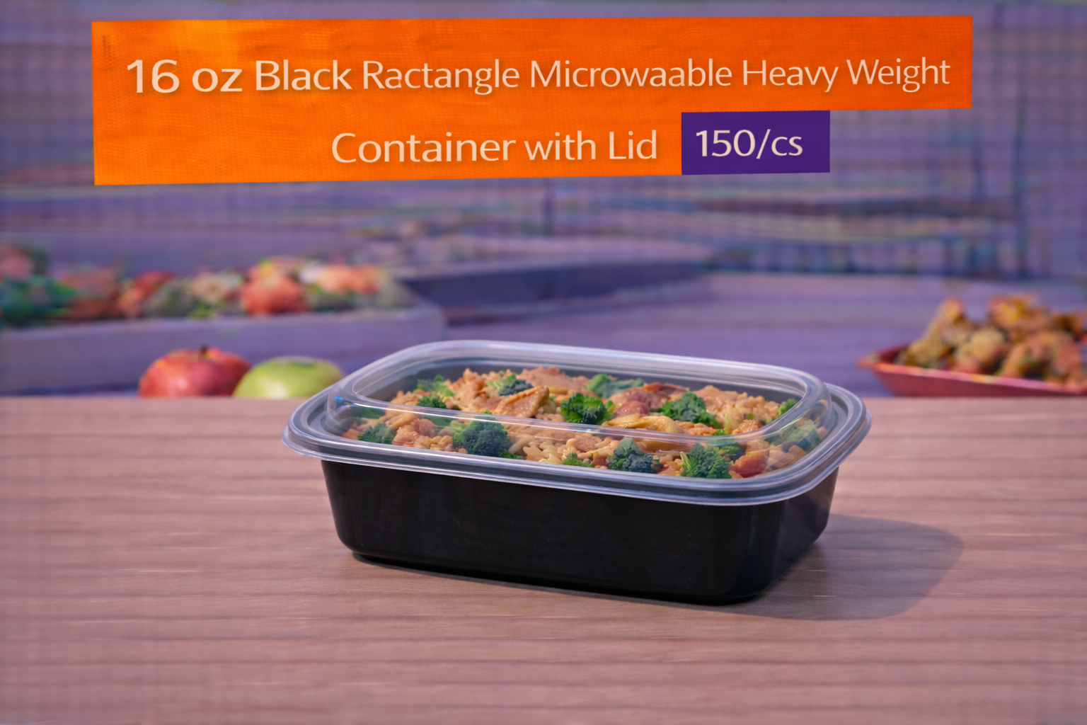 16 oz Black Rectangle Microwavable Heavy Weight Container with Lid – 150/cs by Patel Sales