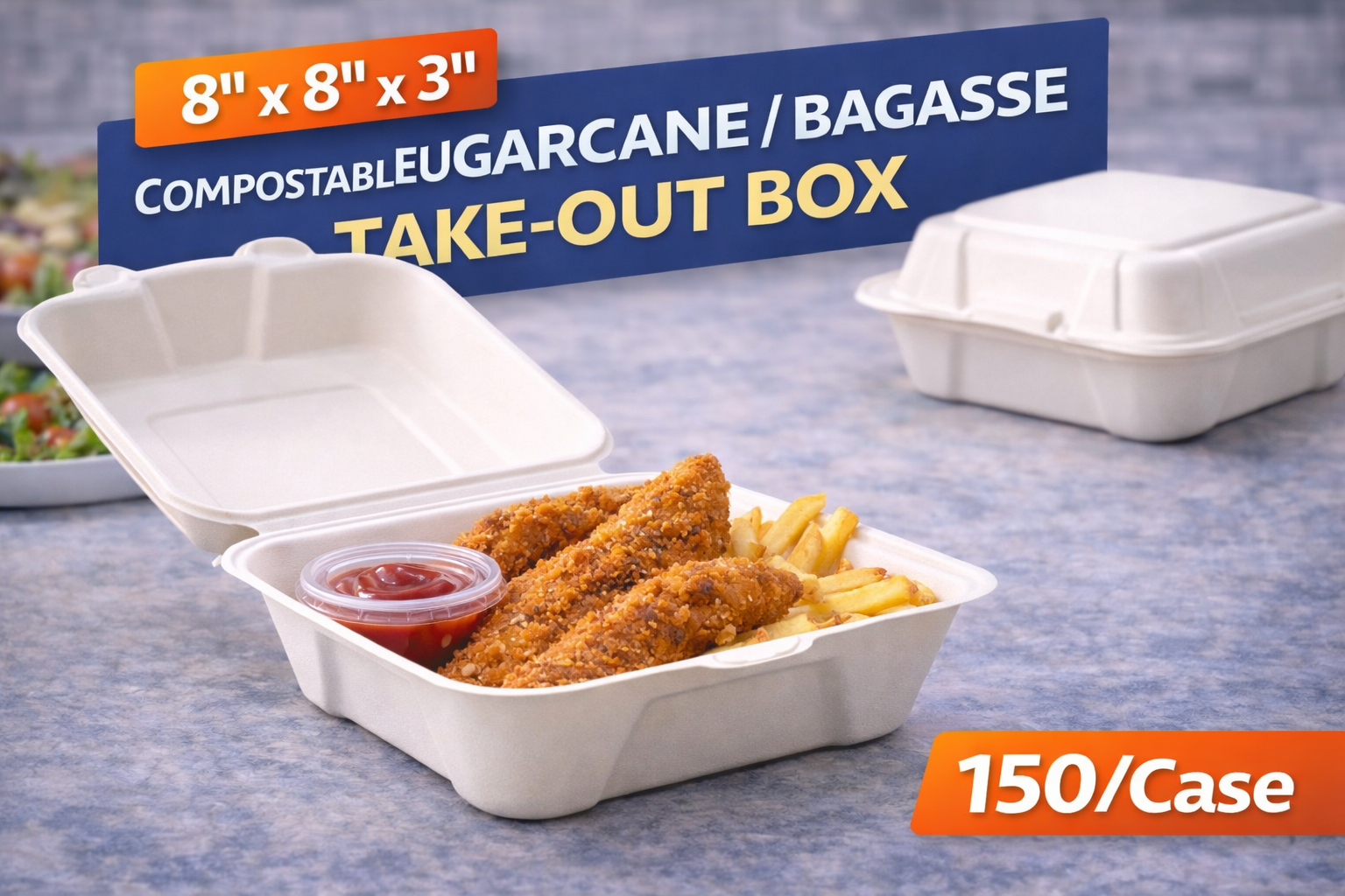 Be the first to review “8″ x 8″ x 3″ Compostable Sugarcane / Bagasse Take-Out Box – 150/Case”